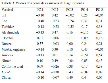 A Tabela 3 apresenta os valores dos pesos das variáveis em cada componente principal do Lago Bolonha.