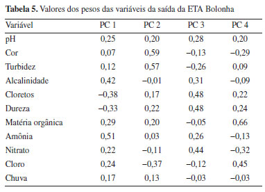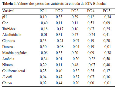 A Tabela 4 apresenta os valores dos pesos das variáveis em cada componente principal da entrada da ETA Bolonha.
