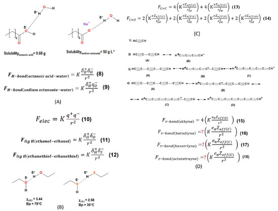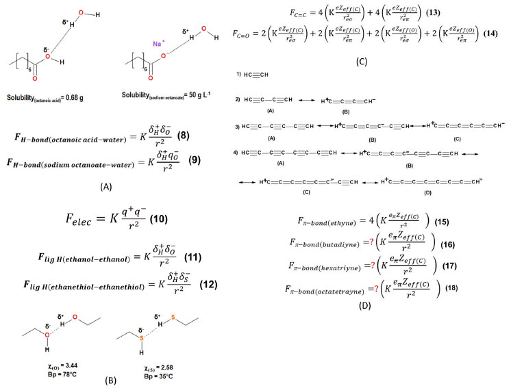 ![]() Figure 2. (A) Schematic representation of the hydrogen bond in octanoic acid and sodium octanoate interacting with water along with their solubilities in water and Equations 8 and 9. (B) Equations 10-12 and schematic representation of the hydrogen bond between a pair of ethanol and a pair of ethanethiol molecules of the question 4 from the questionnaire. (C) Equations 13 and 14 associated with the π bond of C=C and C=O groups, respectively. (D) Resonance structures of butadiyne (2), hexatriyne (3) and octatetrayne (4) and the structure of ethyne (1) for comparison reason along with their corresponding Equations (15-18) of the electrostatic force of π bonds. The numbering of the equations was adapted to this work