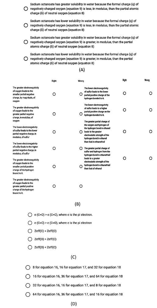 RESULTS AND DISCUSSION Questionnaires for students The questionnaires were given to the students in their native language, Portuguese. Later, the questions were translated into English by Google Translator and some manual corrections were needed. The students had a very short presentation of the electrostatic force applied to organic chemistry in one single class for five-ten minutes. No further information was given until the questionnaire was available to them. Table 1 depicts the first two introductory questions of the questionnaire. They are binary questions, and the results of the students’ answers are shown in Figure 1. Question 1 explains how Coulomb’s law can be adapted to chemistry involving two atoms of partial or full charges. 85.3% of the students found the explanation easy to understand. Question 2 explains why water has a greater boiling point than ammonia using the resource of the electrostatic force associated with the hydrogen bond. It was necessary only one paragraph to explain the reasoning developed in question 2 and 91.2% of the students found it easy to understand. Both questions were intended to prepare the students for more complex questions ahead in the questionnaire. Table 2 depicts the questions of the second part of the questionnaire. There are four single select multiple choice questions. The reference of the figures and the numbering of the equations from these questions were adapted to this work, following its numbering sequence. Question 3 explains the solubility difference between octanoic acid and sodium octanoate through Coulomb’s law applied to chemistry. From the electrostatic force equations (Equations 8 and 9), the text in Table 2 (supported by Figure 2A) explains that the higher atomic charge of the oxygen atom in sodium octanoate is responsible for greater electrostatic interaction with water through the hydrogen bond in comparison with that between octanoic acid and water. This higher electrostatic interaction of the hydrogen bond between sodium octanoate and water explains the higher affinity between the salt and water than the corresponding acid interacting with water. Question 4 is about the boiling points of ethanol and ethanethiol, which are related to their intermolecular interaction, mainly the hydrogen bond (Figure 2B). This question mentions the partial negative and positive atomic charges, which are the terms of the product in the numerator of the electrostatic force equation (Figure 2B). The alternatives to this question comprise five pairs of right and wrong statements, accounting for the greater boiling point of ethanol with respect to ethanethiol rationalized by electrostatic force applied to their corresponding hydrogen bonds. Question 5 provides, along with Figure 2C, the elements to understand how electrostatic force could explain the stronger force of the double bond in carbonyl group (C=O) compared to that from a vinyl group (C=C). In the end, it is requested to establish which electrostatic force factor specifically could explain this. Only one alternative to this question is correct. Question 6 explains that the order of stability: octatetrayne > hexatriyne > butadiyne > ethyne, can be reasoned through resonance theory according to the number of resonance structures (depicted in Figure 2D) for each oligoyne where ethyne is used as reference. Indeed, the text in question 6 provides a further element to rationalize this order of stability: the strength of the π bond (the one which moves across the resonance structures) in the conjugated oligoynes and the inverse relationship between strength and energy. Equations 15 to 18 in Figure 2D indicate that the only difference in the strength of π bond in the oligoynes is the term multiplying the electrostatic equations, which is the product of the total number of resonating π bond electrons and carbon atoms. There is only one correct alternative providing the right number for the term multiplying the electrostatic equation of the π bond in butadiyne, hexatriyne and octatetrayne. Equations 8 to 18 are all electrostatic force equations applied to different situations in the questionnaire. There are slight differences among them which are related to one or more terms in these equations which are needed for comparison purposes in each question. These equations are important for the correct students’ understanding of the electrostatic force in each situation depicted in the questionnaire. Figure 3A shows four alternatives to question 3. All of them focus on the numerator factor of the electrostatic force, i.e., the charges of the atoms, oxygen, and hydrogen, involved in the hydrogen bond of octanoic acid-water and sodium octanoate-water intermolecular interactions, specifically the atomic charge of the oxygen atom in both cases. The correct alternative is the third one from the top to the bottom. 26 students chose the correct alternative representing 76.5% of all participants (see Figure 1S(A) from Supplementary Material). Figure 3B shows the ten statements to question 4, where each pair has one right and wrong alternative comprising five correct and five wrong answers. The alternatives are statements to explain the higher boiling point of ethanol compared to ethanethiol through the reasoning of the electrostatic force in the hydrogen bond of each pair of molecules of the same substance. Each pair of alternatives deal with the same topic (from the upper left to lower right location in Figure 3B): the partial atomic charge of the oxygen atom, the partial atomic charge of the sulfur atom, the partial atomic charge of the hydrogen atom in ethanol, the partial atomic charge of the hydrogen atom in ethanethiol, respectively. The last pair of alternatives (in the bottom right of Figure 3B) are statements involving both partial atomic charges of the hydrogen bond in ethanol and ethanethiol, respectively, reasoning the higher strength of the hydrogen bond. The correct alternative to eac