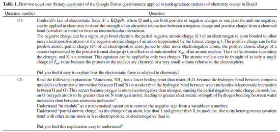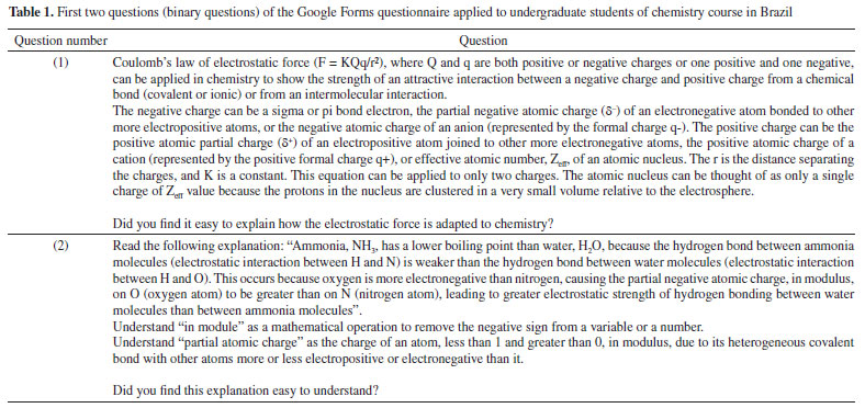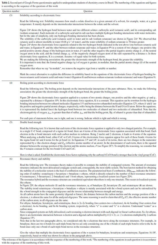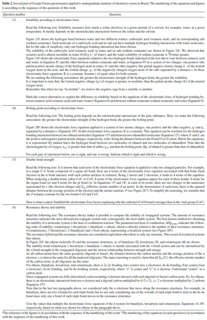 METHODOLOGY It was applied one Google Forms questionnaire to the undergraduate students of chemistry course from the Federal University of Rio Grande do Norte, Brazil who were attending the first discipline of theoretical organic chemistry. The questionnaire was applied at the end of the first semester of 2023. There were 34 participants. The questions and answers were in their native language, Portuguese. Students were requested to answer the questions remotely and in asynchronous mode. Students had only one opportunity to answer the questionnaire, i.e., it was not possible to redo the questionnaire after its submission. Soon after the questionnaire was closed, the questions were translated into English by Google Translator following some manual corrections. Some manual corrections were needed, and the numbering of figures and equations in each question was adapted to this paper (Tables 1 and 2). Figures 1 and 2 were in English format in the Google Forms questionnaire, whose corresponding translations were given in the text of each question. The numbering of the equations in Figure 3 was also adapted to this paper. Google Forms automatically generated the statistical analyses, but Google Translator did not translate the data in their images. Then, they were manually edited and translated.