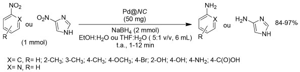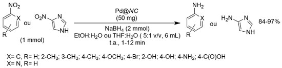 Já em 2019, Chowhan et al.13 relataram a reação de redução de compostos nitro aromáticos empregando boroidreto de sódio (NaBH4) na ausência de base e utilizando Pd@NC, catalisador baseado em partículas ultrafinas de paládio contendo estrutura de carbono dopado com nitrogênio. Essa reação ocorreu em temperatura ambiente, com mistura de EtOH:H2O (5:1 v/v) ou THF:H2O (5:1 v/v) como solvente (Esquema 3). Essa metodologia é seletiva, e as aminas foram obtidas em excelentes rendimentos, entre 84-97%. Além dessas vantagens, o catalisador empregado é estável, facilmente separado por filtração e reutilizado por até seis ciclos de reação.