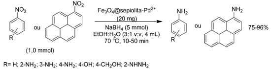 Uma outra metodologia interessante foi reportada por Ghonchepour et al.14 ainda em 2019. Os autores empregaram um método para obtenção de aminas aromáticas a partir dos seus correspondentes nitrocompostos, utilizando Fe3O4@sepiolita-Pd2+ como catalisador, de acordo com o Esquema 4. Nessa reação, boroidreto de sódio (NaBH4) foi empregado como agente redutor e uma mistura de EtOH:H2O (3:1 v/v) foi utilizada como solvente, na temperatura de 70 ºC. As aminas sintetizadas foram obtidas em altos rendimentos (75-96%) e curto periodo reacional (10-50min). O catalisador heterogêneo também pôde ser facilmente separado e recuperado com o auxílio de um ímã.