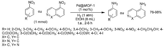 Pang e colaboradores15 sintetizaram, em 2020, diversas aminas aromáticas em bons a excelentes rendimentos (76-98%) através de hidrogenação utilizando Pd@MOF-1, paládio suportado em estrutura metalorgânica, como catalisador, e etanol como solvente, sob atmosfera de hidrogênio, em temperatura ambiente (Esquema 5). A metodologia apresentada é seletiva para a redução do grupo nitro, além de empregar um catalisador estável, facilmente removido da solução por filtração e reutilizado por até cinco ciclos de reação.