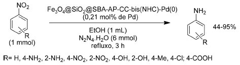 ![]() Esquema 6. Redução de nitrocompostos utilizando Fe3O4@SiO2@SBA-AP-CC-bis(NHC)-Pd(0) como catalisador