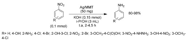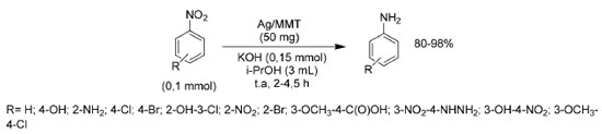 CATALISADORES DE PRATA Karami et al.17 sintetizaram seletivamente diversas aminas aromáticas em excelentes rendimentos (80-98%) utilizando Ag/MTT, um complexo de prata (Ag) em um suporte de argila montmorillonita (MMT), como catalisador. Nesse procedimento foram utilizados base (KOH) e álcool isopropílico (i-PrOH) como solvente e fonte de hidrogênio, em temperatura ambiente, conforme descrito no Esquema 7. Essa metodologia emprega condições de reação mais sustentáveis, incluindo o emprego de um solvente verde, e a utilização de um catalisador estável, que pode ser separado por filtração e reutilizado por até cinco ciclos de reação.