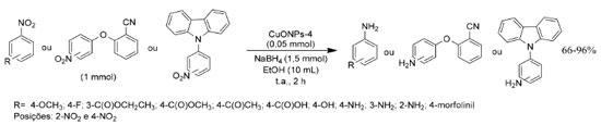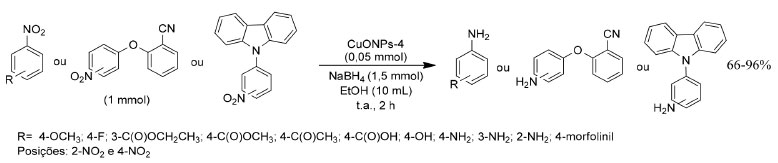 CATALISADORES DE COBRE Em 2017, Anthony e colaboradores18 relataram a reação de redução de compostos nitro aromáticos e empregaram CuONPs-4, catalisador baseado em nanopartículas de cobre encapsuladas em matriz de carbono, nessa transformação. Essa metodologia utiliza NaBH4 como agente redutor e etanol como solvente, em temperatura ambiente (Esquema 8). As aminas sintetizadas foram obtidas em bons a excelentes rendimentos, entre 66-96%. O catalisador utilizado apresenta baixo custo e facilidade de fabricação, apresentando tamanho e forma controlados, além de ter boa estabilidade. O catalisador foi recuperado por centrifugação e pôde ser utilizado por até quatro ciclos de reação.