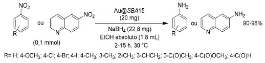 Vaccaro e colaboradores,20 em 2019, sintetizaram um outro catalisador baseado em ouro, o Au@SBA-15, formado por nanopartículas de ouro (Au) incorporadas em uma estrutura bem ordenada de sílica mesoporosa hexagonal (SBA), e analisaram a sua atividade catalítica em reações de redução de nitrocompostos aromáticos para obtenção de suas respectivas aminas. Nesse procedimento, o NaBH4 foi utilizado como agente redutor e o etanol absoluto como solvente, sob aquecimento na temperatura de 30 ºC, de acordo com o Esquema 10. As aminas foram seletivamente obtidas em excelentes rendimentos (90-96%), com exceção da 3-aminoacetofenona e do 4-aminobenzaldeído. A reutilização do catalisador sintetizado foi investigada na reação em batelada e sob condições de fluxo contínuo (0,1 mL min-1) para o p-nitroanisol. O catalisador mostrou-se estável e pôde ser reutilizado por até cinco ciclos reacionais em batelada. A condição de fluxo contínuo aumentou a capacidade de reciclagem do sistema catalítico, apresentando um menor valor de fator ambiental (E = 8) comparado a condição em batelada (E = 23). Todos esses protocolos minimizam a produção de resíduos e empregam solvente verde.