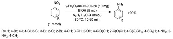 Dong e colaboradores22 sintetizaram o catalisador γ-Fe2O3/mCN-900-20, que consiste em nanopartículas de óxido férrico (Fe2O3) em material de carbono poroso dopado com nitrogênio (CN), e estudaram a sua capacidade catalítica em reações de redução de compostos nitro aromáticos. Essa reação foi realizada em solução de hidrato de hidrazina (N2H4.H2O) como agente redutor e EtOH como solvente verde (Esquema 12). Esse processo se mostrou altamente eficiente, sendo as aminas obtidas em rendimento > 99%, e com seletividade entre 96-100%, gerando apenas subprodutos não agressivos à natureza. Além disso, o catalisador pode ser facilmente recuperado por um ímã, e reutilizado por até quatro vezes.