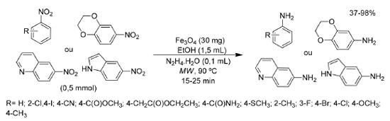 Por fim, Gawande e colaboradores23 propuseram uma metodologia para reações de redução do grupo nitro em compostos aromáticos utilizando a magnetita (Fe3O4) como catalisador, solução de hidrato de hidrazina (N2H4.H2O) como agente redutor, EtOH como solvente verde e aquecimento via radiação de micro-ondas, conforme Esquema 13. As aminas foram obtidas em altos rendimentos entre 92-98% e com uma conversão dos nitrocompostos entre 93-99%. A única exceção foi para a amina substituída com a amida na posição 4 do anel aromático, obtida em um rendimento de 37% e com 42% de conversão do respectivo nitrocomposto. O catalisador é seletivo para a redução do grupo nitro, facilmente separado utilizando um ímã e pode ser reciclado por até dez vezes sem perder a sua capacidade catalítica.
