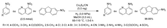 Já em 2018, Queen e colaboradores25 reportaram a síntese e utilização em reações de redução de nitrocompostos aromáticos do catalisador Co3S4/CN, derivado de estruturas metal-orgânicas (MOFs), que consiste em uma nanocaixa oca de sulfeto de cobalto (Co3S4) impregnada em carbono dopado com nitrogênio (CN). Para investigar a atividade catalítica dessa substância nas reações-alvo, os autores utilizaram estruturas diversas de nitrocompostos aromáticos como substrato, em etanol como solvente verde sob atmosfera de H2 (3,0 Mpa) e em aquecimento (60 ou 110 ºC), conforme mostrado no Esquema 15. As aminas sintetizadas foram obtidas em altos rendimentos, entre 96-99%, após um tempo reacional entre 1,5-6 h. Esse protocolo é uma ótima alternativa, verde e sustentável, para a redução de grupos nitro em anéis aromáticos, empregando, também, um catalisador estável, que é prontamente reutilizado por até três ciclos de reação, além de apresentar alta seletividade (> 99%), que implica na simplicidade de separação do produto e redução do consumo de solventes orgânicos.
