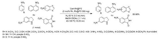 CATALISADORES DE RÓDIO Sharma et al.28 apresentaram uma metodologia de hidrogenação seletiva do grupo nitro de diversos compostos aromáticos empregando um reator em fluxo. Nesse aparato o nanocatalisador heterogêneo Rh@PS, constituído de nanopartículas de ródio (Rh) suportadas em poliestireno (PS), foi inserido em um cartucho vazio de 70 mm de comprimento, gerando o nanocatalisador heterogêneo Cart-Rh@PS. Nesse procedimento foram utilizados hidrogênio molecular (H2) na concentração de 60% à vazão de 0,5 mL min-1 e uma mistura de EtOAc/MeOH (1:1 v/v) como solvente, em uma temperatura entre 40-100 ºC (Esquema 18). Através da metodologia em fluxo foi possível obter as aminas aromáticas desejadas em excelentes rendimentos (85-98%) e em um curto tempo reacional (10-20 min), sem a necessidade de etapas adicionais de purificação do produto, além de não requerer que o catalisador seja separado do meio, sendo reativado por até doze utilizações. Esse protocolo ainda tem como vantagem a sua execução na escala de um grama para obtenção da p-toluidina, do 4-aminofenol e do 4-aminobenzonitrilo, em 93, 94 e 85% de rendimento, respectivamente.
