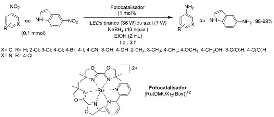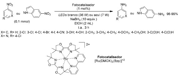 CATALISADORES DE RUTÊNIO No ano de 2019, Lee e colaboradores34 reportaram a síntese a utilização de um complexo de rutênio (Ru) contendo ligantes bisoxazolina e bipiridina em reações de redução de compostos nitro aromáticos para obtenção de suas respectivas aminas. Nesse procedimento foram utilizados boroidreto de sódio (NaBH4) como agente redutor e etanol como solvente, na presença de luz visível, e em temperatura ambiente (Esquema 22). O grupo nitro foi seletivamente reduzido na maioria das substâncias, com exceção dos nitrocompostos substituídos com aldeídos, onde observou-se que os grupos nitro e aldeído foram reduzidos simultaneamente. Cabe destacar que todos os produtos foram obtidos em excelentes rendimentos (89-99%). Esse protocolo de catálise fotoredox emprega condições de reação suaves, econômicas e ecológicas e, além disso foi empregada na redução do p-iodo-nitrobenzeno, em escala de 12 g, sendo a respectiva amina obtida com 85% de rendimento, após 8 h sob luz solar.