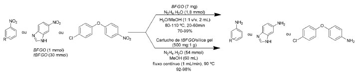 CATALISADORES BIMETÁLICOS A estratégia de implementar catalisadores bimetálicos em reações de redução de nitrocompostos vem sendo amplamente explorada por diversos autores. Em 2017, Liang e colaboradores37 sintetizaram dois catalisadores a base de bismuto, ferro e óxido de grafeno, BFGO e tBFGO, e empregaram na reação de redução de diversos nitrocompostos aromáticos para obtenção de alguns intermediários essenciais na síntese de produtos farmacêuticos, agroquímicos e corantes. Essa redução foi executada na presença de uma mistura de solventes MeOH:H2O (1:1 v/v) (BFGO) ou somente em MeOH (tBFGO), e hidrato de hidrazina (N2H4.H2O), conforme demonstrado no Esquema 24. Dois processos distintos foram avaliados, em banho com aquecimento entre 90-110 ºC e em reator de fluxo contínuo (1 mL min-1) com aquecimento de 90 ºC, para as reações empregando BFGO e tBFGO, respectivamente. As aminas foram obtidas em melhores rendimentos (92-98%) e com alta seletividade (> 99%), em apenas 1 min, na reação catalisada por tBFGO, quando comparada a reação utilizando BFGO, em que as aminas foram obtidas em rendimentos entre 70-99% e com seletividade entre 68-100%, em um tempo reacional entre 20-60 min. Esses protocolos apresentam como vantagens o fácil manuseio do agente redutor, um procedimento limpo e o emprego de catalisadores não tóxicos, e que podem ser reutilizados por até dez ciclos de reação.