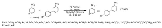 Também no ano de 2017, Subrahmanyam e colaboradores38 relataram a redução de compostos nitro aromáticos, na ausência de solvente, na presença de nanopartículas de paládio e ouro (Pd-Au) impregnadas em óxido de titânio (TiO2) como catalisador, além de hidrato de hidrazina (N2H4.H2O) (Esquema 25). Essa metodologia foi seletiva para a formação de aminas substituídas com duplas e triplas ligações, aldeídos, cetonas e ésteres, sendo todas as substâncias sintetizadas obtidas com rendimentos que variaram de bom a excelente (67-96%). Esse procedimento apresenta como vantagens o curto período reacional (5-60 min), condições de temperatura e pressão ambientes, e a utilização de um catalisador estável, altamente ativo devido ao pequeno tamanho das nanopartículas de Pd-Au, utilizado em baixa quantidade (0,1 mol%) e que pode ser recuperado por centrifugação e reutilizado por até cinco ciclos de reação.