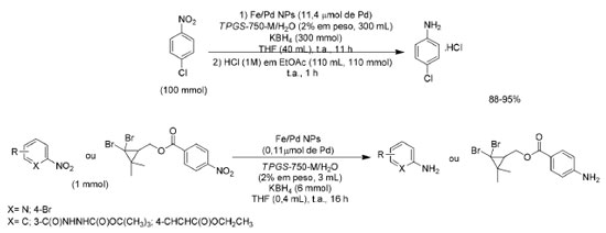 Outra metodologia relevante foi reportada por Gallou e colaboradores39 em 2017. Os autores relataram a redução, em escala de 100 mmol, de 1-cloro-4-nitrobenzeno para obtenção do cloridrato de 4-cloroanilina, e realizaram, também, a redução de diferentes nitrocompostos aromáticos em escala de 1,0 mmol (Esquema 26). Nesse procedimento foram utilizadas nanopartículas de paládio (Pd) suportadas em nanomateriais de ferro (Fe/Pd NPs) como catalisador. O boroidreto de potássio (KBH4) é capaz de ativar esse catalisador, liberando nanopartículas de ferro (Fe) para a solução, além de atuar como fonte de hidreto. Nesse protocolo são utilizados o surfactante TPGS-750-M/H2O, que auxilia na dispersão dos nitrocompostos, e o cossolvente THF, que auxilia na dissolução desses compostos e na estabilização de suas emulsões. Essa metodologia é uma alternativa sustentável e segura para redução de nitrocompostos aromáticos, utilizando temperatura e pressão ambientes, e baixas quantidades de paládio (0,11 e 11,4 µmol), além de reduzir a formação de subprodutos, ser seletiva para o grupo nitro, e fornecer as aminas desejadas em excelentes rendimentos (88-95%).