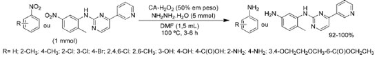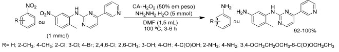 MISCELÂNEA Zhang e colaboradores42 desenvolveram um protocolo de redução de compostos nitro aromáticos para obtenção das suas respectivas aminas, utilizando hidrato de hidrazina (N2H4.H2O) como agente redutor, carvão ativado (CA) tratado com peróxido de hidrogênio como catalisador e dimetilformamida (DMF) como solvente sob aquecimento, na temperatura de 100 ºC (Esquema 29). As aminas sintetizadas foram obtidas em excelentes rendimentos (92-100%) e o sistema catalítico mostrou-se seletivo para o grupo nitro na presença de outros grupos funcionais como halogênios e ácido carboxílico no anel aromático. Esse protocolo, também, mostrou-se adequado na redução do N-(5-nitro-2-metilfenil)-4-(3-piridil)pirimidina-2-amina, importante intermediário para a produção do fármaco anticâncer Imatinibe. Essa metodologia se apresenta como uma alternativa sustentável para a redução de compostos nitro aromáticos, utilizando um catalisador reciclável que pode ser reutilizado por até cinco vezes sem perder sua capacidade catalítica.