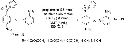 Outro procedimento interessante foi relatado por Tanaka e colaboradores.43 Os autores desenvolveram uma metodologia one-pot, em escala de grama, para realizar a reação de redução de nitrocompostos aromáticos, contendo substituintes deficientes em elétrons, através de um protocolo one-pot e em escala de gramas. Nesse procedimento são utilizadas acroleína, uma amina primária (propilamina), cloreto de cálcio (CaCl2) e DMF, sob aquecimento na temperatura de 100 ºC, conforme Esquema 30. Nessas condições, o agente redutor, 3-formil-3,4-diidropiperidina (FDP), é gerado in situ a partir da acroleína e propilamina. As aminas sintetizadas foram obtidas em bons rendimentos (57-84%). Esse procedimento é simples, utiliza reagentes baratos e menos nocivos, sendo uma alternativa sustentável para reações de redução de compostos nitro aromáticos, sem o uso de metais.