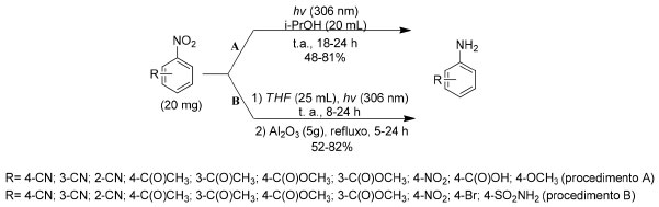 A radiação ultravioleta (UV) em 306 nm foi utilizada por Chuang e colaboradores44 em dois procedimentos para síntese de aminas primárias aromáticas a partir dos nitrocompostos correspondentes (Esquema 31). O primeiro procedimento de fotorredução foi realizado em álcool isopropílico (i-PrOH), em temperatura ambiente, e com tempo reacional entre 18-24 h. O segundo procedimento utilizou tetraidrofurano (THF) a temperatura ambiente por 8-24 h, com posterior tratamento da mistura reacional com óxido de alumínio (Al2O3), sob refluxo, por 5-24 h. As aminas sintetizadas foram obtidas em rendimentos entre 48-81%, utilizando i-PrOH, e entre 52-82%, utilizando THF. Ambas as metodologias propostas foram eficientes para a redução de nitrocompostos aromáticos com substituintes retiradores de elétrons, oferecendo alternativas sustentáveis para esse tipo de reação.