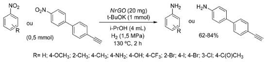 Nishina e colaboradores,45 no ano de 2019, realizaram reações de redução do grupo nitro em compostos aromáticos utilizando óxido de grafeno reduzido dopado com nitrogênio (NrGO) como catalisador, juntamente com o terc-butóxido de potássio (t-BuOK) como base, e álcool isopropílico (i-PrOH) como solvente, sob atmosfera de H2 (1,5 MPa) e aquecimento de 130 ºC, de acordo com o Esquema 32. As aminas sintetizadas foram obtidas com rendimentos que variaram de bom a excelente (62-84%), com destaque para a seletividade do catalisador para o grupo nitro frente a outros grupos funcionais (halogênios, alquino e cetona). Esse procedimento reportado é uma contribuição relevante, sendo uma solução simples e ecológica para a redução de compostos nitro aromáticos na ausência de catalisadores de metais nobres. Cabe também ressaltar que o catalisador utilizado pode ser reciclado e reutilizado por até quatro vezes.