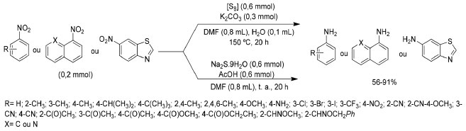 Em 2019, Deng e colaboradores46 desenvolveram duas metodologias para a redução de nitrocompostos aromáticos a partir de agentes redutores à base de enxofre (S). Na primeira metodologia o sistema catalítico consistiu no uso do enxofre elementar (S8) na presença de carbonato de potássio (K2CO3) como base, em uma mistura de água e dimetilformamida (DMF) como solventes, sob aquecimento na temperatura de 150 ºC. Já a segunda metodologia ocorreu em temperatura ambiente e foi utilizado sulfeto de sódio nonahidratado (Na2S.9H2O) como agente redutor, na presença de ácido acético (AcOH), utilizando-se DMF como solvente (Esquema 33). As aminas sintetizadas por esses procedimentos foram obtidas em rendimentos semelhantes, entre 56-91%. A metodologia, utilizando Na2S.9H2O e AcOH, também, foi aplicada na redução em escala de gramas (1,74 g) da 8-nitroquinolina, sendo o produto obtido com bom rendimento (75%). Esses protocolos são, também sustentáveis, e empregam condições reacionais brandas, sem o uso de metais de transição.