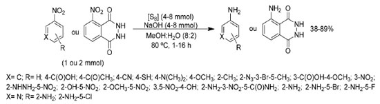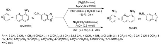 ![]() Esquema 33. Redução de nitrocompostos utilizando reagentes a base de enxofre (S) como agentes redutores