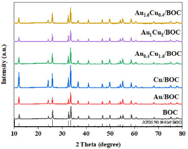 RESULTS AND DISCUSSION The crystalline phases and compositions of the prepared BiOCl, Au/BiOCl, Cu/BiOCl, and AuxCuy/BiOCl were detected by XRD (Figure 1). The XRD peaks of BiOCl were well indexed to the tetragonal structure of BiOCl (JCPDS No. 06-0249). After the deposition of Au and Cu, the diffraction peaks of BiOCl (JCPDS No. 06-0249) were found in the XRD patterns of all catalysts, reflecting that Au and Cu nanoparticles were only deposited on the surface of the catalyst without affecting the crystalline phase of BiOCl. However, no diffraction peaks of Au and Cu were observed in AuxCuy//BiOCl due to its low loading counts and uniform dispersion.