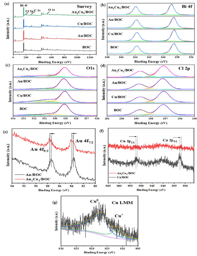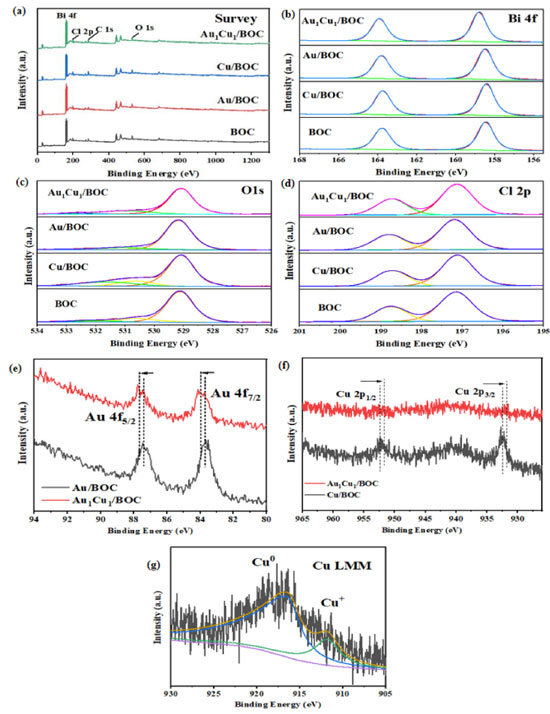 ![]() Figure 2. XPS spectra for full-spectrum scanning survey (a); Bi 4f (b); O 1s (c); Cl 2p (d); Au 4f (e); Cu 2p (f), and Cu LMM Auger (g) of the photocatalysts