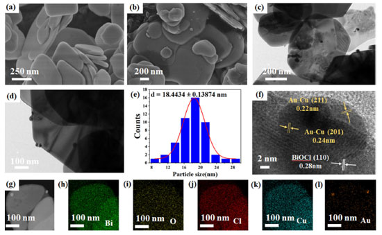 ![]() Figure 3. SEM image (a) of BiOCl, SEM image (b) of Au1Cu1/BiOCl, TEM images (c-d), particle size distribution diagram (e), HR-TEM image (f) and elemental mapping images (g-l) of Au1Cu1/BiOCl