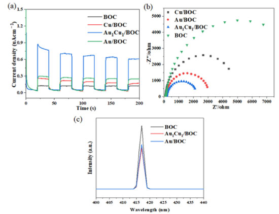 To make clear the prominent CO2 photocatalytic reduction performance of Au1Cu1/BiOCl, electrochemical experiments were conducted. As shown in Figure 4a, Au1Cu1/BiOCl exhibits a stronger photocurrent response than BiOCl, Cu/BiOCl, and Au/BiOCl, suggesting that Au1Cu1/BiOCl has better electron and hole pair separation efficiency. In addition, the interfacial charge transfer characteristics of BiOCl, Cu/BiOCl, Au/BiOCl, and Au1Cu1/BiOCl were studied via electrochemical impedance spectroscopy (EIS) (Figure 4b). Au1Cu1/BiOCl has the smallest arc radius. In general, the smaller the arc radius displayed by photocatalysts, the smaller the electron transfer resistance. Au1Cu1/BiOCl has the smallest arc radius, reflecting a favorable surface charge transfer speed on the surface of the photocatalyst.37 Time-resolved fluorescence emission attenuation spectroscopy was used to further study the material. The average fluorescence lifetime of pure BiOCl is slightly higher than that of Au1Cu1/BiOCl, possibly due to the efficient photogenerated charge transfer speed (Figure 4c). In conclusion, the introduction of AuCu nanoparticles onto the surface of BiOCl nanosheets helps to accelerate the diffusion of photogenerated electrons to the catalyst surface, inhibits the recombination rate of electrons and holes, and allows more photogenerated electrons and holes to participate in subsequent reactions, greatly improving the catalyst's activity.