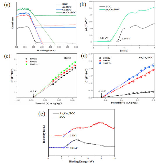 ![]() Figure 5. (a) UV-Vis absorption spectra of photocatalysts. (b) Tauc's plots of pure BiOCl and Au1Cu1/BiOCl. (c) Mott-Schottky plots of pure BiOCl. (d) Mott-Schottky plots of Au1Cu1/BiOCl. (e) Valence-band XPS spectra of pure BiOCl and Au1Cu1/BiOCl samples