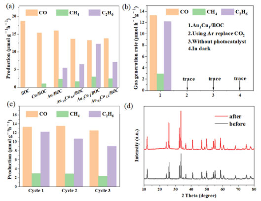 ![]() Figure 6. (a) CH4, C2H6, and CO production rates over different photocatalysts after 3 h sunlight (AM 1.5 G) irradiation. (b) The obtained gas products over Au1Cu1/BiOCl under different conditions. (c) Photocatalytic stability of Au1Cu1/BiOCl. (d) XRD pattern of Au1Cu1/BiOCl before and after photocatalytic CO2 reduction experiment