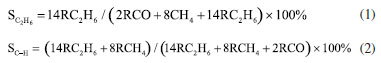 EXPERIMENTAL Reagents and solutions Bismuth nitrate pentahydrate Bi(NO3)3.5H2O (99%), potassium chloride, CuCl2.2H2O (99.9%), HAuCl4.3H2O (99.9%), and ethanol were purchased from Shanghai Chemical Reagents Co., Ltd. This experiment used deionized water (18.2 MΩ cm). The reagents used in the experiment were used directly without treatment, unless otherwise stated. Material fabrication BiOCl was prepared using the hydrothermal method. First, 0.002 mol Bi(NO3)3.5H2O and 0.002 mol KCl were added to 30 mL of a mixed solution of water and ethanol (ethanol:water, 1:1). After stirring for 30 min, we transferred this solution to a 100 mL Teflon-lined autoclave and maintained it at 120 °C for 8 h. After the reaction was completed, it was cooled to room temperature, centrifuged at 8000 r min-1, and washed four times with water and ethanol, respectively. Lastly, we dried the sample at 60 °C for 12 h. A series of BiOCl photocatalysts modified with Cu-Au NPs were obtained by a stepwise photoreduction deposition method. Typically, 0.15 g of BiOCl nanosheet was added to 40 mL of deionized water and subjected to ultrasonic treatment for 10 min. Under intense stirring, different amounts of HAuCl4 solution (5.0 g L-1) were added dropwise to the mixed solution. Then, the solution was stirred and irradiated under a Xenon lamp (500 W) for 30 min. Similarly, different amounts of CuCl2.2H2O solution (5.0 g L-1) were added dropwise to the mixed solution and irradiated for another 30 min. Eventually, the sample was centrifuged at 8000 r min-1 and was washed with deionized water four times. The resulting sample was dried at 60 °C for 12 h. The total Au and Cu content of AuxCuy/BiOCl was fixed at 2 wt.%, where x and y are the content of Au and Cu, respectively. Au/BiOCl, Au1.6Cu0.4/BiOCl, Au1Cu1/BiOCl, Au0.4Cu1.6/BiOCl, and Cu/BiOCl photocatalysts were obtained by adding variable amounts of aqueous HAuCl4.3H2O and CuCl2.2H2O solutions. Characterization The X-ray power diffraction (XRD) was analyzed via a Bruker D8 Focus X-ray diffractometer (Bruker, Mannheim, Germany) with Cu-Kα radiation (λ = 0.154178 nm). Transmission electron microscopy (TEM) and high-resolution TEM (HRTEM) were performed using a transmission electron microscope (JEM-2100F, Kyoto, Japan). The UV-Visible diffuse reflectance spectra of the samples were acquired using a UV-Vis spectrophotometer (Cary4000, Agilent, Petaling Jaya, Malaysia). X-ray photoelectron spectroscopy (XPS) was performed via an ESCALAB 250 spectrometer (Thermo Fisher Scientific, Waltham, MA, USA) with an Al-Kα (1486.6 eV) line to obtain the elements and chemical state. The photoluminescence (PL) emission spectra were measured on a RF-5301PC fluorescence spectrophotometer (Shimadzu, Kyoto, Japan). The measurement of photocurrent reaction and electrochemical impedance spectroscopy (EIS) were carried out using a traditional three-electrode system with a 0.1 M Na2SO4 electrolyte solution on an electrochemical system (CHI 760, Shanghai, China). Photocatalytic test The catalyst (5.0 mg) was added to deionized water (400 µL) and then treated with ultrasound to form a suspension, which was dispersed on the surface of a 3.5 cm glass slide. After drying, we placed the slide in the bottom of a 135 mL reaction chamber and added 100 µL of deionized water to the reactor to provide a hydrogen source. Next, we sealed the reactor with a transparent quartz lid and ventilated it with pure CO2 (99.9%) for 15 min. Lastly, the reactor was irradiated by simulated sunlight (PLS-SXE300D), with nearly 200 mW cm-2 light intension. The gaseous sample was taken out every hour and examined by gas chromatography (Shimadzu, GC-2014A) using a conductivity detector (TCD) and a flame ionization detector (FID). The selectivity of products was calculated using the equations shown below: ![]() where SC2H6 and SC-H represent the selectivity of ethane and alkane (ethane and methane), respectively.