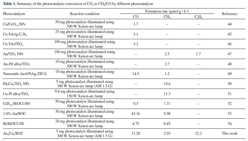 CONCLUSIONS In conclusion, bimetallic AuCu nanoparticle BiOCl nanosheets were successfully prepared. AuCu nanoparticles have a special surface plasmon resonance effect, which enhances the catalytic activity of the catalyst, improves the separation efficiency of photogenerated carriers, and realizes efficient charge transfer. As a result, compared with pure BiOCl nanosheets and many reported materials, the prepared composites can generate more valuable C2H6 during the photocatalytic reduction process. Au1Cu1/BiOCl has a C2H6 yield of 12.2 μmol h-1g-1 and a C2H6 selectivity of 77.3%.