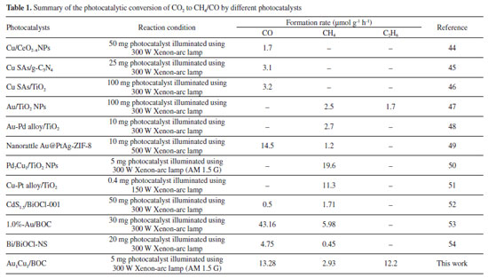 Department of Chemistry, College of Chemistry and Material Science, Jinan University, 510632 Guangzhou, China Recebido em 21/09/2023 *e-mail: tyangj@jnu.edu.cn BiOCl nanosheets modified with AuCu nanoparticles were successfully designed and fabricated for water reduction of CO2. The AuxCuy/BiOCl composites exhibited enhanced visible light absorption ability due to a surface plasmon resonance (SPR) effect. The AuxCuy/BiOCl composites could convert carbon dioxide to ethane (C2H6), while only CO was obtained over pure BiOCl nanosheets. In this study, the rate of C2H6 production (12.2 μmol h-1 g-1) and selectivity of C2H6 (75.7%) were obtained over the Au1Cu1/BiOCl photocatalyst under simulated sunlight illumination. The AuCu nanoparticles played the dual role of electron traps and hot electron donors, facilitating efficient separation and migration of the carriers. The photocatalyst exhibited steady photocatalytic activity over the test duration of 9 h. INTRODUCTION The increasing level of global industrialization has exacerbated the emission of carbon dioxide, and the large-scale combustion of fossil fuels such as coal and oil has caused serious threat to the human environment.1 In 2020, China put forward the "double carbon" goal of "carbon peak" and "carbon neutrality", which is an important strategy to solve the prominent problem of resource and environmental constraints. Scientists are seeking ways to decrease the concentration of CO2 in nature, such as converting CO2 into worthy fuels and valuable chemicals. The full conversion and effective treatment of CO2 are crucial tasks.2 The specific measures to achieve the "dual carbon" goal are not only to directly reduce CO2 emissions but also to convert CO2 as a rich C1 resource into chemicals with higher added value, as an effective approach to sustainability. The photoreduction conversion process of CO2 and H2O using semiconductors is green, economical and clean. It uses inexhaustible solar energy and the H2O in nature as energy and proton sources, which can greatly reduce greenhouse gas emissions and achieve carbon neutrality.3 To date, in the CO2 photoreduced process, CO and CH4 are mainly generated; there are few studies on the production of C2+ products during this reduction process.4 Among the various CO2 reduction products, C2+ products have attracted much attention compared to C1 products because of the characteristics of high energy density and high added economic value. However, due to the different and complex electron transfer pathways involved in CO2 photocatalytic reduction, it remains a challenge to selectively convert CO2 into higher-level carbon species, such as ethane.5 There are many factors, such as the surface architecture and band gap width of the photocatalyst, as well as whether it can provide an effective catalytic active site and charge transfer channel, that affect the catalytic performance of C2+. How to regulate the selectivity of C2+ products is an important direction for research in the field of energy.6 Therefore, the construction of photocatalysts with effective charge separation efficiency to achieve regulatable photocatalytic reduction of CO2 to C2+ products is very important. As a new two-dimensional semiconductor nanomaterial, BiOCl has enormous research potential due to its unique structural advantages. BiOCl is a layered PbFCl-type tetragonal structure, with [Cl-Bi-O-Bi-Cl] layers stacked by Van der Waals forces. Four O atoms and four Cl atoms in the layer combine with one Bi atom through chemical bonds, resulting in a square antiprism structure, presenting an alternating arrangement of Cl−/[Bi2O2]2+ bilayers. Therefore, layered structures can induce the formation of internal electric fields along the (001) direction, providing abundant space for polarized atoms and atomic orbitals, which helps to induce dipole moments to separate electrons and holes.7 Its unique structure facilitates the separation of photogenerated charge carriers, thereby promoting electron migration to surface active sites and accelerating catalytic reactions, making it a promising material for the photocatalytic reduction of CO2. At present, there is a large body of research applying BiOCl to the field of photocatalysis, demonstrating good photocatalytic performance for various photocatalytic reactions. However, there are few studies on the use of BiOCl for the photocatalytic reduction of CO2.8 Very recently, Wang et al.9 found that CO2 can be efficiently converted into ethane (C2H6) over bismuth-rich bismuth oxybromide nanotubes (Bi12O17Br2) modified with gold nanoparticles. Bimetallic nanoparticles show different electrical, chemical, optical, and other characteristics compared to single metal nanoparticles due to the synergistic effect between metals. Especially in the field of catalysis, they show better performance.10-12 The synergistic effect of bimetallic nanoparticles is crucial for achieving effective catalytic cycling. Metal particles can help photogenerated electrons diffuse faster to the surface of catalysts and act as acceptors, reducing the probability of electron-hole recombination. Therefore, compared to single metal nanoparticles, different bimetals, such as gold platinum bimetallic,13-15 gold copper bimetallic,16 gold palladium bimetallic,17,18 and gold silver bimetallic nanoparticles,19-21 have better catalytic performance in highly concerned photocatalytic reactions. Compared to Au or Cu monometallic photocatalysts, it was reported that AuCu bimetallic nanoparticles have stronger photocatalytic activity during CO2 reduction.22-24 Previous studies have shown that the generation efficiency of thermal holes and electrons in catalysts is the key to improving photocatalytic efficiency. Photocatalytic materials composed of plasmonic noble metal nanoparticles and semiconductor materials can effectively extract and collect thermal holes, stimulating more electrons and holes.25-27 In addition, Sato et al.28 found tha