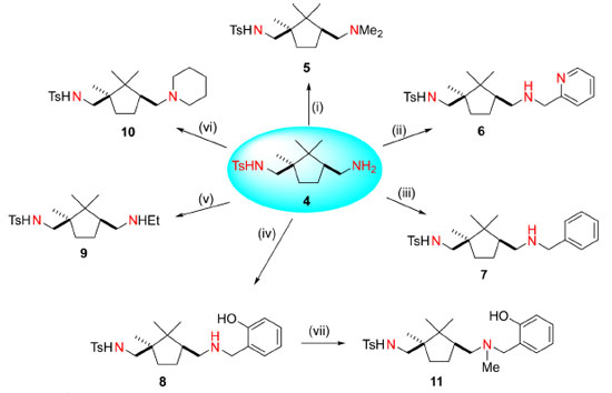![]() Scheme 2. Synthesis of new chiral 1,5-diamine derivatives. Reagents and conditions: (i) H2CO, AcOH, NaBH3CN, MeOH, r.t. 75%; (ii) 2-pyridinecarboxaldehyde, AcOH, molecular sieves, NaBH3CN, MeOH, r.t. 76%; (iii) benzaldehyde, AcOH, molecular sieves, NaBH3CN, MeOH, r.t. 75%; (iv) salicylaldehyde, AcOH, molecular sieves, NaBH4, MeOH, r.t. 76%; (v) (a) CH3COCl, Et3N, DCM; (b) LiAlH4, THF, reflux, 46% (for two steps); (vi) 1,5-diiodopentane, K2CO3, CH3CN, reflux, 79%; (vii) HCO2H, H2CO, reflux, 72%