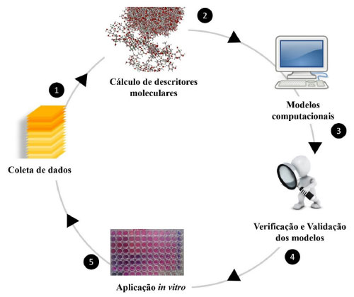 ![]() Figura 1. Ciclo do processo de criação do modelo computacional com abordagem LBVS em QSAR; iniciando pela coleta de dados (1), seguindo para cálculo de descritores moleculares (2), modelos computacionais (3), verificação e validação dos modelos (4) e por fim a aplicação in vitro (5) que seguirá para a etapa 1 em um ciclo contínuo (fonte: elaborado pelo autor)