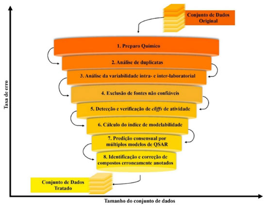 MINERAÇÃO DE DADOS Há disponível hoje uma grande quantidade de informação de moléculas em vários repositórios de domínio público e privado, e para processar essas informações é necessário ferramentas computacionais. Por exemplo, no PubChem, um repositório público de estruturas químicas e suas propriedades biológicas há mais de 115 milhões de compostos e 1,5 milhão de bioensaios.45-47 É uma quantidade de dados absurda que são atualizados diariamente, possuindo uma variedade enorme de informação de resposta alvo. Semelhante ao PubChem, há também o ChEMBL que já foi mencionado acima. Comparado ao PubChem, no ChEMBL há uma grande quantidade de informações de dados selecionados manualmente da literatura. Estima-se que no ChEMBL contenha mais de 2,4 milhões de compostos testados contra mais de quinze mil alvos biológicos.45,48 Há outras fontes projetadas especificamente para medicamentos e candidatos a fármacos, como o DrugBank que é um banco de dados público que contém todos os medicamentos aprovados e informações como seus mecanismos de ação, interações e alvos relevantes.45,49 Há também disponível na internet vários bancos de dados voltados para metabólitos secundários, disponibilizando informações importantes para pesquisadores de produtos naturais, como o Dicionário de Produtos Naturais (DPN), NAPRALERT, Marinelit para produtos naturais marinhos, o NPASS que além de metabolitos secundários fornece valores de atividade experimental e informações de fontes de espécies, propriedades químicas, NuBBEDB a primeira biblioteca de produtos naturais da biodiversidade brasileira, BIOFACQUIM, um banco de dados de produtos naturais isolados e caracterizados no México, há também bancos de produtos naturais provenientes de bactérias como o PAMDB e o StreptomeDB (Pseudomonas aeruginosa e gênero Streptomyces, respectivamente) e há o SistematX com um diferencial por fornecer bancos estruturais com capacidade de busca por estrutura, código SMILES (sistema simplificado de entrada de linha de entrada molecular), informações do nome do composto e espécie, possibilidade de salvar estruturas químicas encontradas pela busca, contém informações e características importantes para a química de produtos naturais e o usuário pode encontrar informações específicas sobre classificação taxonômica (da família a espécie) da planta a partir da qual o composto foi isolado, além das referências bibliográficas e do sistema de posicionamento global (GPS) da molécula pesquisada.50-56 Esses dados disponíveis podem e devem ser trabalhados para gerarem informações, e no nosso caso, esses dados devem ser trabalhos para obtenção de informação de novos possíveis medicamentos, ou seja, na descoberta de novas drogas. Assim, após a obtenção de dados precisamos minerá-lo para extrair as informações e o conhecimento que buscamos. A mineração de dados são processos e etapas que serão realizadas para explorar e analisar uma grande quantidade de dados em busca de padrões, previsões, erros, associações, etc.57 A mineração de dados está geralmente associada ao aprendizado de máquina. Mas para minerar dados é importante que esses dados sejam de qualidade. Dados com problemas, como erros em estruturas químicas e resultados experimentais, dificultam e se tornam um grande obstáculo para a construção de modelos preditivos.33,58,59 Por essa razão é preciso avaliar a qualidade dos dados, o que Fourches et al.60 denominaram de "cinco Is", ou seja, avaliar se os dados podem estar incompletos, imprecisos, incorretos, incompatíveis e/ou irreprodutíveis. Os autores ainda reforçam a necessidade de tratar os dados como o primeiro passo crítico em qualquer estudo de análise de dados com o intuito de garantir estabilidade e confiabilidade dos resultados obtidos. Fourches et al.60 propuseram ainda um fluxo geral de tratamento de dados químicos e biológicos, visando estudos de QSAR. O fluxo está representado na Figura 2 o qual apresenta 8 etapas que serão explicadas a seguir: