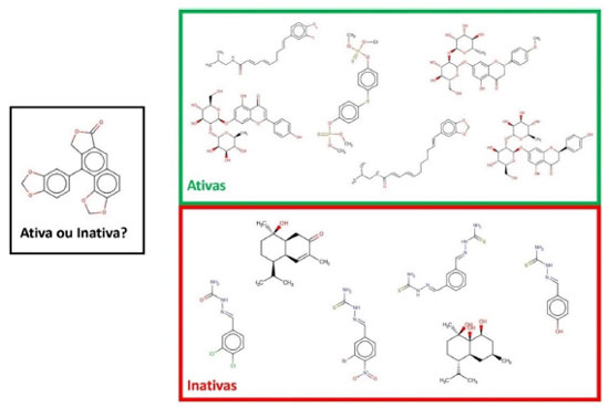 ![]() Figura 3. Representação de um modelo de classificação. No quadrado preto uma molécula será predita entre as classes ativa (retangulo verde) ou inativa (retangulo vermelho) (fonte: elaborado pelo autor)