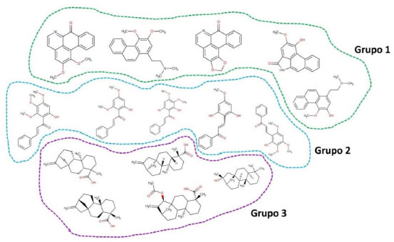 ![]() Figura 4. Representação de um modelo de agrupamento. Moléculas sendo agrupadas em diferentes grupos de acordo com suas similaridade químicas (fonte: elaborado pelo autor)