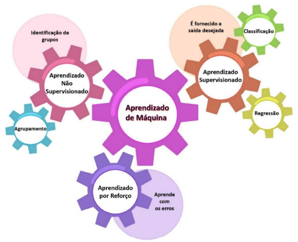 Outro tipo de classificação de ML é com relação a técnica utilizada, podendo ser aprendizado supervisionado, não supervisionado e por reforço. No aprendizado supervisionado é fornecido ao algoritmo informações de entrada e saída desejada, onde o objetivo será encontrar uma regra geral que mapeia as entradas as saídas desejadas, ou seja, a variável dependente esperada. Um exemplo de aprendizado supervisionado são os modelos de classificação. No aprendizado não supervisionado não são fornecidas as informações de saída desejada, desta forma, o algoritmo precisa encontrar padrões nos arquivos de entrada. Um exemplo de aprendizado não supervisionado são os modelos de agrupamento. No aprendizado por reforço o objetivo é que o algoritmo aprenda com seus erros a tomar a melhor decisão para se chegar ao objetivo. Ou seja, no apredizado por reforço os modelos são treinados para desenvolver uma sequência de decisões para que se chegue ao objetivo da melhor forma. No aprendizado por reforço, o modelo irá enfrentar um problema, e por meio de tentativa e erro, deverá encontrar a solução, então o algoritmo irá realizar diversas tentativas a fim de alcançar seu objetivo, onde para cada tentativa será atribuído recompensas ou punição dependendo da decisão que foi tomada e assim o algoritmo vai se ajustando até alcançar uma margem satisfatória ou o objetivo proposto. Um exemplo desse aprendizado é um tipo de rede neural artificial.20,45,74,77 A Figura 5 mostra as classificações do aprendizado de máquina.