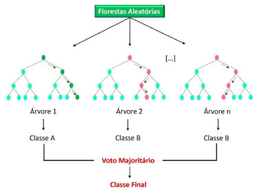 ![]() Figura 6. Representação do algoritmo florestas aleatórias. O modelo cria uma estrutura de decisão em forma de árvore e a cada nova instância ela é percorrida até chegar a um nó terminal onde está a classe (fonte: elaborado pelo autor)