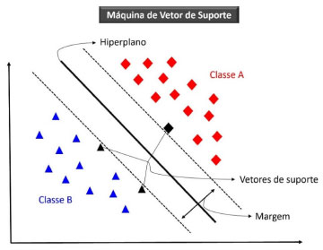 ![]() Figura 7. Representação do algoritmo máquina de vetor de suporte (SVM). O algoritmo separa as classes por meio de um hiperplano ao identificar as amostras mais distantes entre as classes, os vetores de suporte. Os vetores de suporte maximizam a margem de sepraração entre as classes (fonte: elaborado pelo autor)