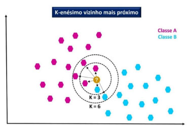 ![]() Figura 8. Representação do algoritmo k-enésimo vizinho mais próximo (k NN). A instância "?"será classificada de acordo com sua semelhança entre os vizinhos próximos defino pelo K. Quando K = 3 ou 6, a instância será classificada como classe A por apresentar mais semelhança e proximidade com instâncias da classe A (fonte: elaborado pelo autor)