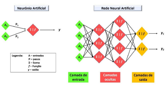 ![]() Figura 10. Representação de um neurônio artificial e de uma rede neural artificial. No neurônio artificial, cada entrada (A1 e A2) recebe apenas um tipo de sinal ou informação e possui um peso (P1 e P2) que irá determinar a influência do sinal no resultado do processamento. Na rede neural há uma grande quantidade de neurônios, assim, temos uma camada de entrada, camadas ocultas onde ocorre a determinação do peso de cada entrada, e aplicação soma e função, e por fim as camadas de saída onde será definido o resultado final do processamento (fonte: elaborado pelo autor)