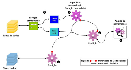 ![]() Figura 11. Representação global de um modelo computacional utilizando aprendizado de máquina. (1) Partição estratificada do conjunto de dados em 80% treino e 20% teste. (2) O conjunto de treino é apresentado ao algoritmo para aprendizado e geração do modelo computacional. (3) O conjunto de teste é utilizado no modelo para obter sua predição. (4) A partir da predição do conjunto de teste é realizada a análise de performance do modelo criado. (5) Predição de novos dados utilizando o modelo criado (fonte: elaborado pelo autor)