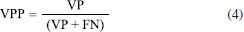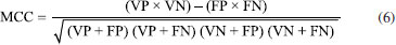 A partir da matriz de confusão várias métricas podem ser calculadas para avaliar o modelo fornecendo informações fundamentais para total compreensão de seu desempenho. Essas métricas são: precisão (acurácia), sensibilidade, especificidade, verdadeiro preditivo positivo, verdadeiro preditivo negativo, coeficiente de correlação de Matthews e a curva ROC (características operacionais do receptor, do inglês receiver operating characteristics). Cada uma será explicada detalhadamente a seguir. Precisão (acurácia - ACC): se refere a taxa de acerto global do modelo. O quanto que o modelo está classificando corretamente tanto os positivos como os negativos. É calculada da seguinte maneira: ![]() Em que P é o total de amostras positivas, e N o total de amostras negativas. Sensibilidade: avalia a taxa de acerto do modelo apenas das amostras positivas, ou seja, a capacidade de aprendizado do modelo em classificar uma amostra verdadeiramente positiva como positiva. ![]() Especificidade: temos informação da capacidade de aprendizado do modelo em classificar amostras verdadeiramente negativas como negativas, ou seja, a taxa de acerto das amostras negativas. ![]() Verdadeiro preditivo positivo (VPP): diz respeito a taxa de acerto de amostras verdadeiros positivos em relação a toda predição de positivos. ![]() Verdadeiro preditivo negativo (VPN): informa a taxa de acerto de amostras verdadeiras negativas em relação a toda predição de negativos. ![]() Coeficiente de correlação de Matthews (MCC): esse coeficiente nos ajuda a ter informação de performance global do modelo. Seu valor varia entre -1 e 1, onde um coeficiente de valor 1 indica um modelo de predição perfeita, o 0 indica um modelo de predição aleatória, e -1 indica um modelo em total desacordo entre o que previsto e o que é verdadeiro.97 Dessa forma, buscamos modelos que possuam um MCC o mais próximo de 1 possível, é calculado da seguinte forma: ![]() Curva ROC: a curva ROC nos mostra de maneira bidimensional o desempenho real do modelo com mais clareza que a precisão, conciliando a especificidade e sensibilidade. A curva ROC é expressa através do cálculo da área abaixo da curva (AUC), que é uma porção de um quadrado unitário, assim seu valor pode variar de 0 a 1, mas na prática costuma variar ente 0.5 e 1, onde 1 é um desempenho perfeito e 0,5 um modelo completamente aleatório. Em geral, não há modelos classificadores piores que os aleatórios, por esta razão, não se considera modelos com valores de curva ROC abaixo de 0,5. O gráfico da curva ROC é plotado pelo valor da sensibilidade (eixo Y), o valor dos verdadeiros positivos, em função do valor de falsos positivos, ou seja, 1 menos especificidade.96 A Figura 13 representa a plotagem da curva ROC.