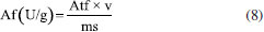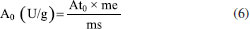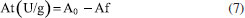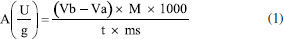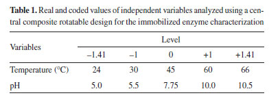 Enzyme loading test Enzyme solutions were prepared in phosphate buffer in 0.1 mol L-1 at pH 7.0 and different concentrations, i.e. 10, 15, 20, 30 and 35 mg mL-1. A 1 g carrier sample was used for immobilization by varying the enzyme solution concentration. The suspension was separated in a funnel to collect the supernatant, and then it underwent filtration and drying. Hydrolytic activities of the control (without enzyme), supernatant and immobilized enzyme were measured. For comparison purposes, their fixed asset yield and recovered activity were observed and calculated according to Lima et al.21 The fixed asset yield (AY) was calculated using Equation 4: ![]() To calculate the recovered activity (RA) using Equation 5: ![]() where: At is the theoretically immobilized activity (U g-1); Ader: activity of the immobilized derivative (U g-1). A0 is the activity offered during immobilization, measured in the control and calculated by Equation 6: ![]() where: At0 is the activity of the enzyme solution (U g-1); me: enzyme mass (g); ms: support mass (g). At: is the theoretically immobilized activity, calculated using Equation 7: ![]() Af is the non-immobilized activity, measured by the supernatant, calculated using Equation 8: ![]() where: Atf is the final activity of the supernatant (U mL-1); v: final volume of the supernatant (mL); ms: support mass (g). Immobilized enzyme characterization Optimal pH and temperature Optimal pH and temperature of the immobilized enzyme were defined by carrying out a 22 central composite rotational design (CCRD) using the software Protimiza Experimental Design®.22 Tests were performed at different incubation bath temperatures and pH conditions for the phosphate buffer in 0.1 mol L-1 solution used in the enzymatic solution. The response variable was hydrolytic activity.20Table 1 shows the values selected for each variable under analysis.