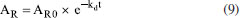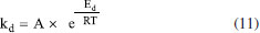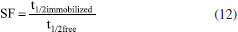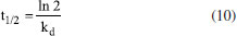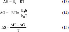 Thermal stability To evaluate the immobilized enzyme thermal stability, 0.25 g samples were incubated in a 2 mL phosphate buffer (0.1 mol L-1 and pH 7.0) and then placed in a bath at different temperatures (35, 41 and 45 °C) under agitation. For comparative purposes, the same tests were performed for the free enzyme using an enzyme solution of 0.5 mg mL-1. At each pre-established time (0, 15, 30, 45 and 60 min), samples were immediately cooled in an ice bath, then a 1 mL aliquot of the enzyme solution and immobilized enzyme sample was removed, in addition to a 2.5 mL olive oil emulsion so as to measure the hydrolytic activity20 of samples. Kinetics and thermodynamics Kinetic and thermodynamic deactivation parameters were determined for free and immobilized enzymes. The thermal inactivation constant kd (min-1) and half-life time t1/2 (min) of free and immobilized enzyme were calculated by performing a nonlinear regression of the relative hydrolytic activity as a function of time,23 according to Equations 9 and 10: ![]()