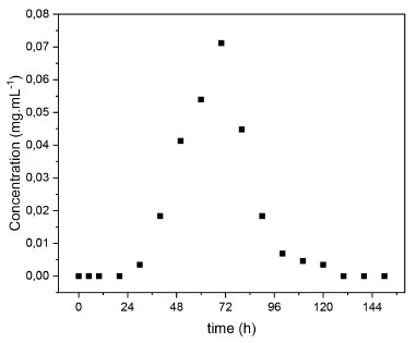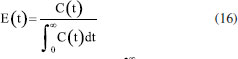 Fixed bed reaction Hydrodynamic characterization of the fixed bed reactor After injecting dye into the reactor's feed line, samples were collected at the reactor output and their absorbances were measured. A correlation between absorbance A (nm) and dye concentration C (mg mL-1) is expressed by Equation 24: ![]() Concentration as a function of time C(t) was determined and the coefficient of determination (R2 = 98.39%) indicated good model fit to experimental data. To calculate the E(t) function, the denominator of Equation 16 was determined from the area under the curve of the C(t) plot. The E(t) function was calculated for each time period and the area below/at the bottom of the residence time distribution graph (Figure 5) was determined, and average residence time was obtained through Equation 17. All plots and areas were drawn using the OriginPro 8® software.25
